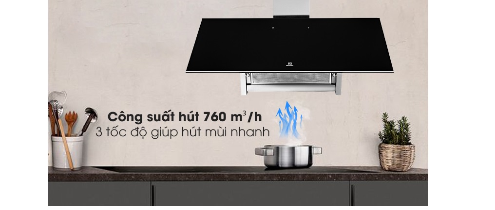 - Máy hút mùi áp tường có công suất hút lớn tới 760 m³/h, 3 tốc độ giúp hút mùi nhanh
