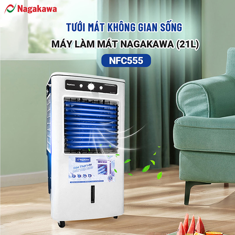 Máy làm mát Nagakawa NFC555 có thiết kế sang trọng với màu trắng và ghi trang nhã. Thân máy trơn láng, tối giản chi tiết nhằm hạn chế bám bụi và dễ dàng vệ sinh. Sản phẩm phù hợp với mọi không gian sống như phòng khách, phòng ngủ, hành lang, thư viện, cửa hàng, mà không làm ảnh hưởng đến giá trị thẩm mỹ.
