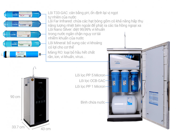 – Lõi lọc số 9 (Đèn UV): Lắp đặt ở vị trí cuối cùng trong hệ thống lọc, ngăn chặn 99,99% vi khuẩn với các bước sóng phá hủy cấu trúc ADN của vi khuẩn, diệt khuẩn cực nhanh, giữ nguyên mùi vị của nước. Là lớp khóa bảo vệ thứ 2 của máy lọc nước Karofi