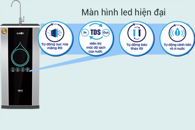 - Khi chỉ số TDS của nước sau lọc hiển thị cao hơn mức độ khuyến nghị, máy sẽ có tín hiệu từ màn hình LED và còi để cảnh báo. Màn hình hiển thị TDS của máy lọc nước thông minh Karofi iRO 2.0 giúp người dùng có thể thấy tường tận độ tinh khiết và chủ động kiểm soát được chất lượng nước trong mỗi lần sử dụng.