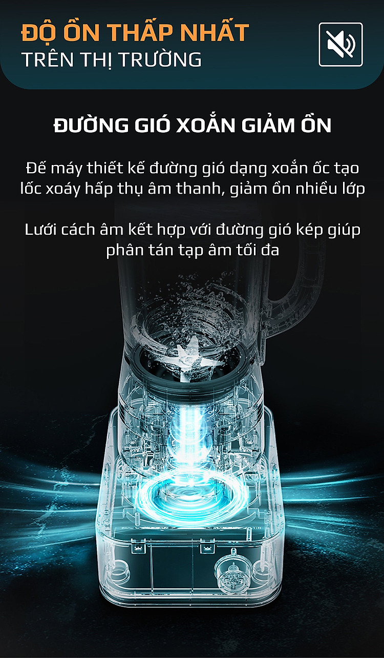- Thiết kế đế máy với đường gió dạng xoắn ốc tạo lốc xoáy hấp thụ âm thanh, giảm ồn nhiều lớp. Lưới cách âm kết hợp với đường gió kép giúp phân tán tạp âm tối đa.
