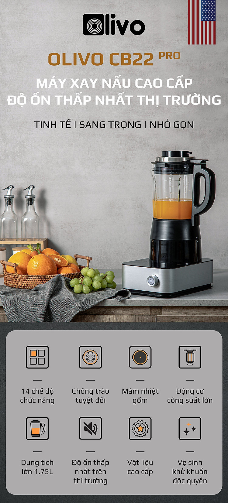 - Với những công nghệ độc quyền của Olivo với sản phẩm máy xay nấu đa năng CB22 PRO được trang bị động cơ thông minh, cấu tạo từ những vật liệu cao cấp giúp máy hoạt động êm ái và không tạo tiếng ồn lớn như các dòng máy khác.