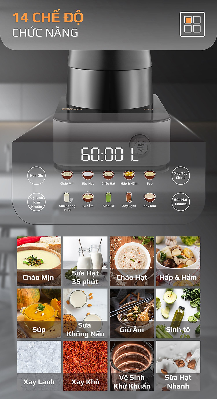 - Với 14 chế độ chức năng : Nấu cháo mịn, làm sữa hạt, nấu cháo nguyên hạt, nấu món hầm, hấp, nấu súp, làm sữa không nấu, làm sinh tố, xay lạnh , xay khô nhiều công dụng tích hợp trong chỉ 1 chiếc máy.