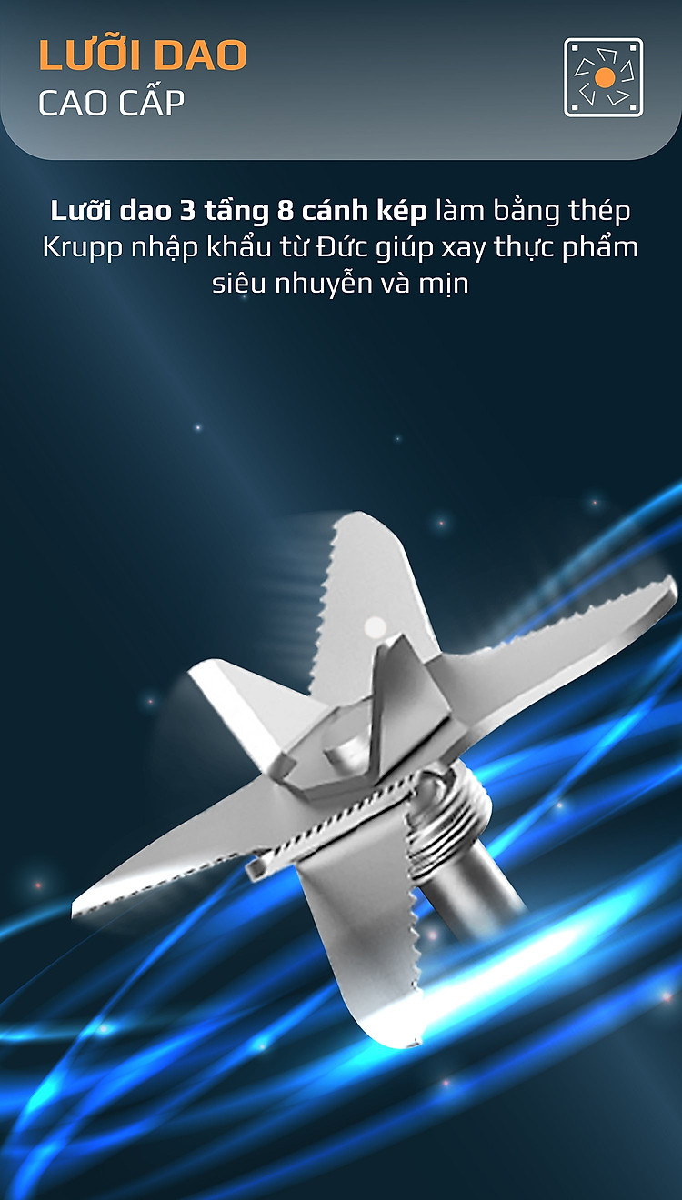 - Lưỡi dao 3 tầng 8 cánh làm bằng thép Krupp nhập khẩu từ Đức, vòng xoay 360 độ, giúp xay thực phẩm siêu nhuyễn và mịn.