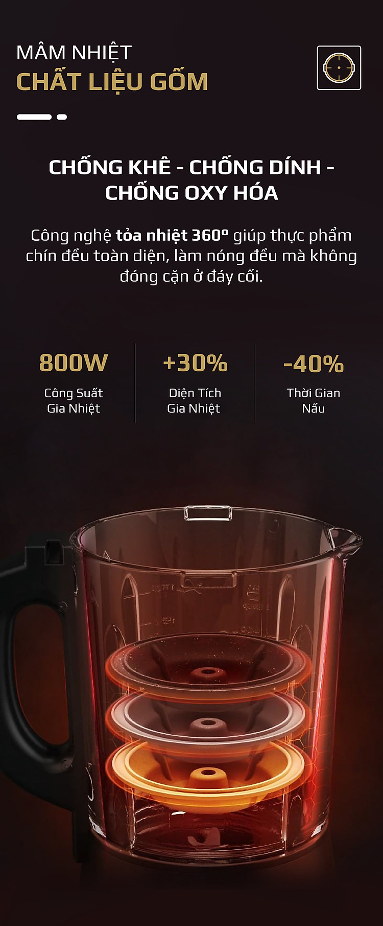 - Mâm nhiệt chất liệu gốm là một ưu điểm vượt trội trên các dòng sản phẩm của OLIVO. Kết hợp với thiết kế đáy cối lõm làm tăng diện tích gia nhiệt lên thêm 30%, giảm 40% thời gian nấu và dễ dàng vệ sinh. Nhiệt lượng được tỏa đều 360 độ giúp thực phẩm chín đều mà không bị đóng cặn ở đáy cối.