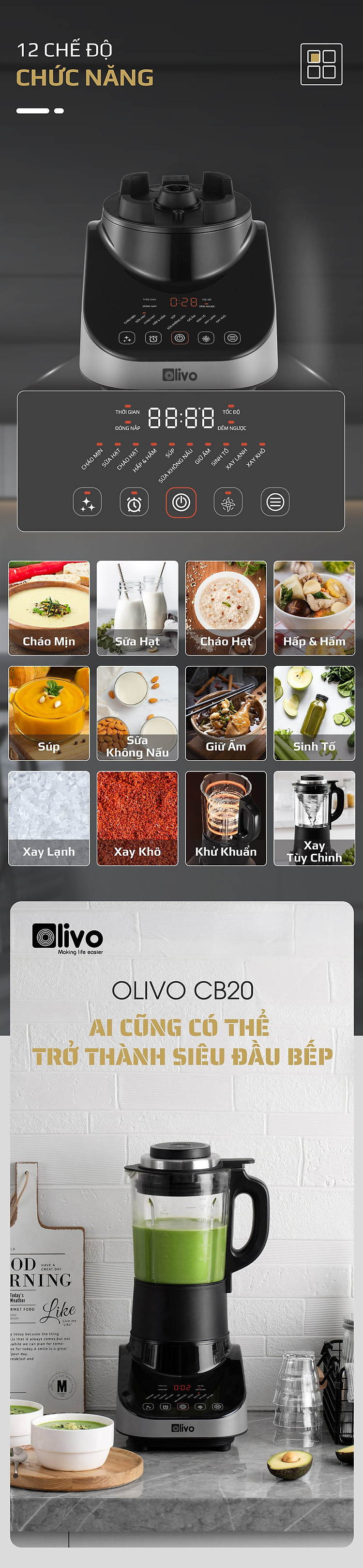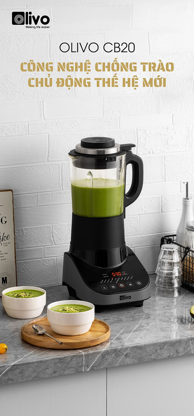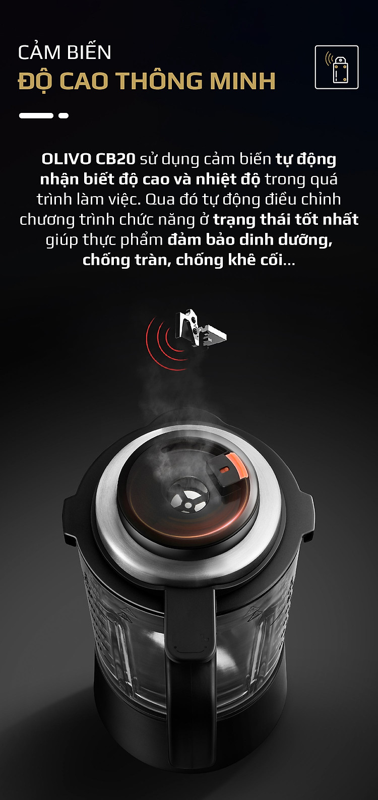 - Đây là điểm mới cải tiến vượt bậc của sản phẩm mới lần này. OLIVO CB20 có thể sử dụng cảm biến để nhận biết độ cao và nhiệt độ trong quá trình làm việc. Đồng thời điều chỉnh chức năng ở trạng thái tốt nhất giúp thực phẩm đảm bảo dinh dưỡng, chống tràn, chống khê cối…