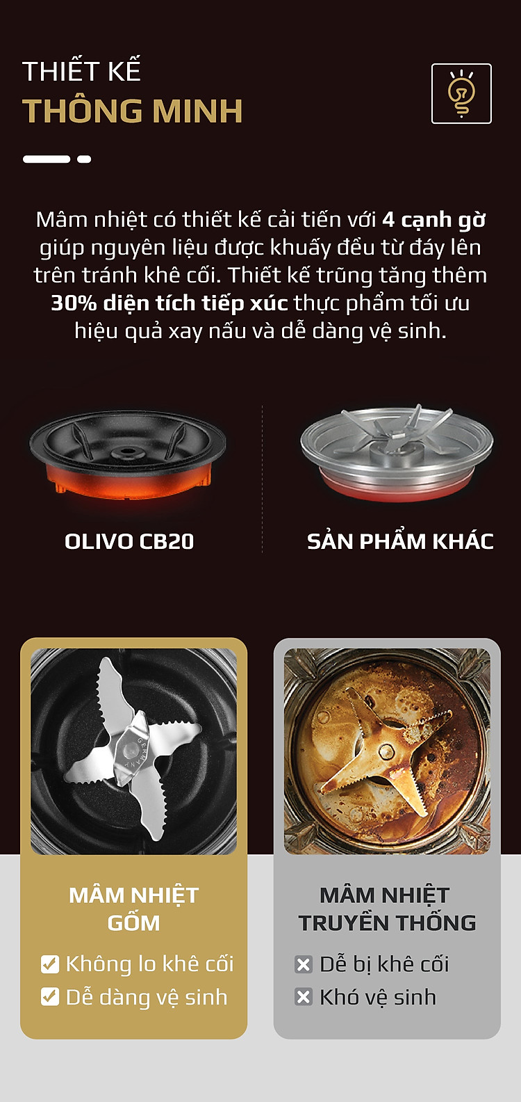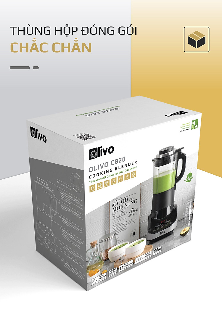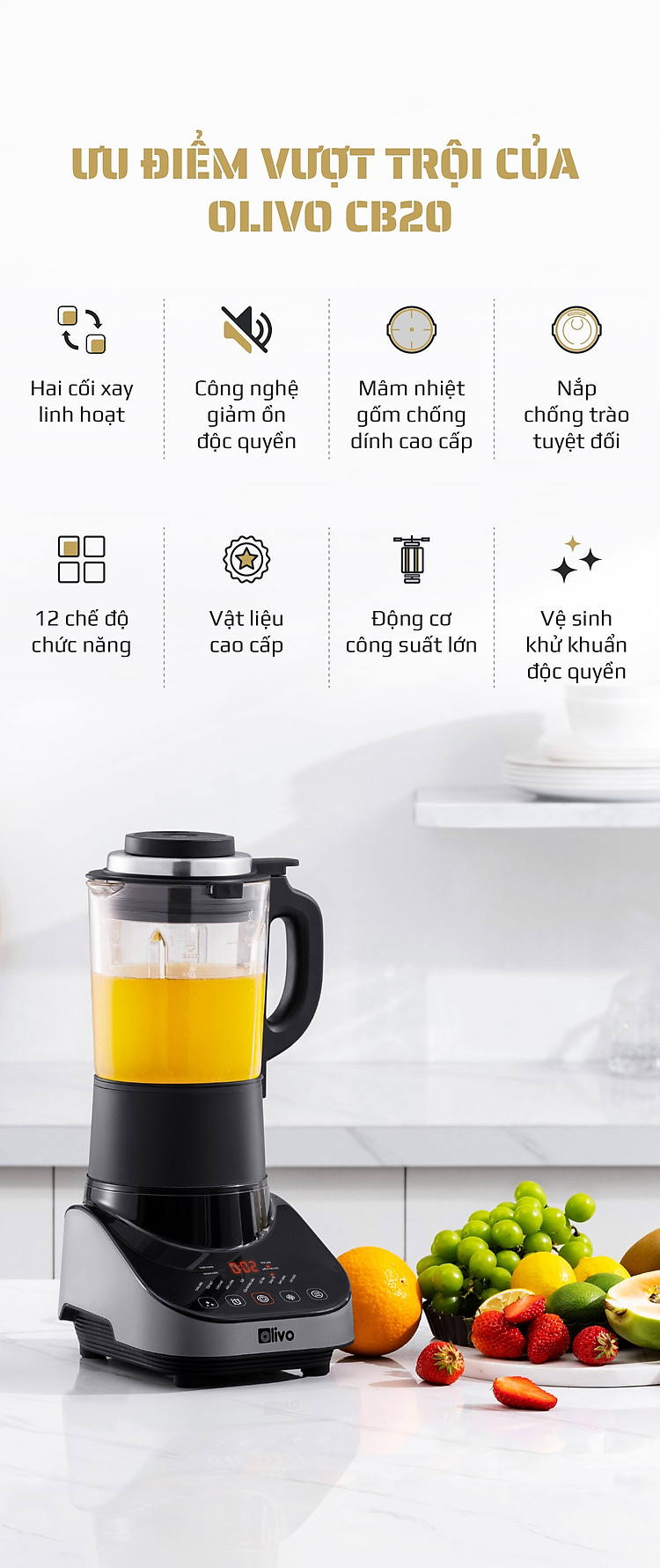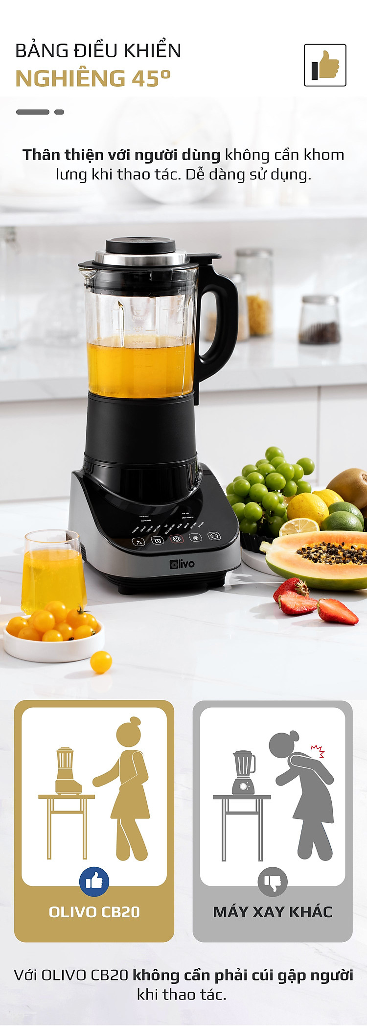 - Đây là điểm mới cải tiến vượt bậc của sản phẩm mới lần này. OLIVO CB20 có thể sử dụng cảm biến để nhận biết độ cao và nhiệt độ trong quá trình làm việc. Đồng thời điều chỉnh chức năng ở trạng thái tốt nhất giúp thực phẩm đảm bảo dinh dưỡng, chống tràn, chống khê cối…