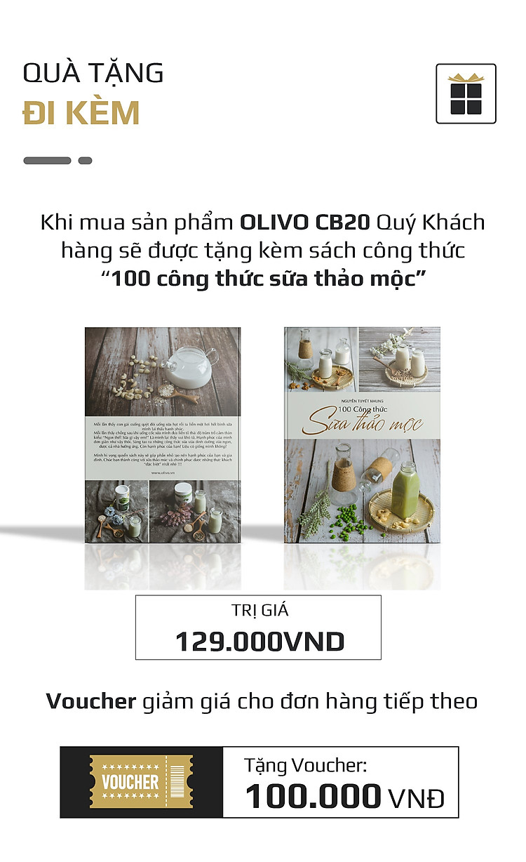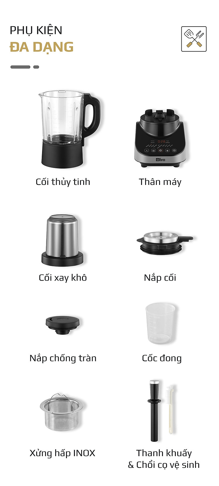 - Còn những dịp cuối tuần có nhiều thời gian rảnh hơn OLIVO CB20 sẽ phát huy hết công dụng với bộ phụ kiện đa dạng: xửng hấp, cối xay khô, thay khuấy… để hỗ trợ bạn làm các món hấp, hầm, nấu súp…
