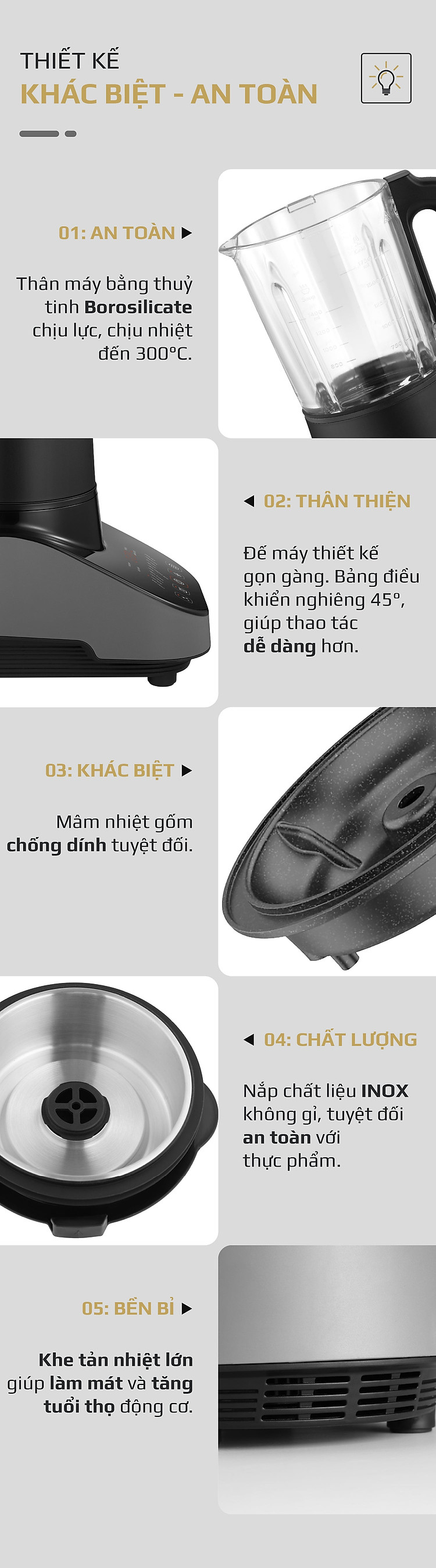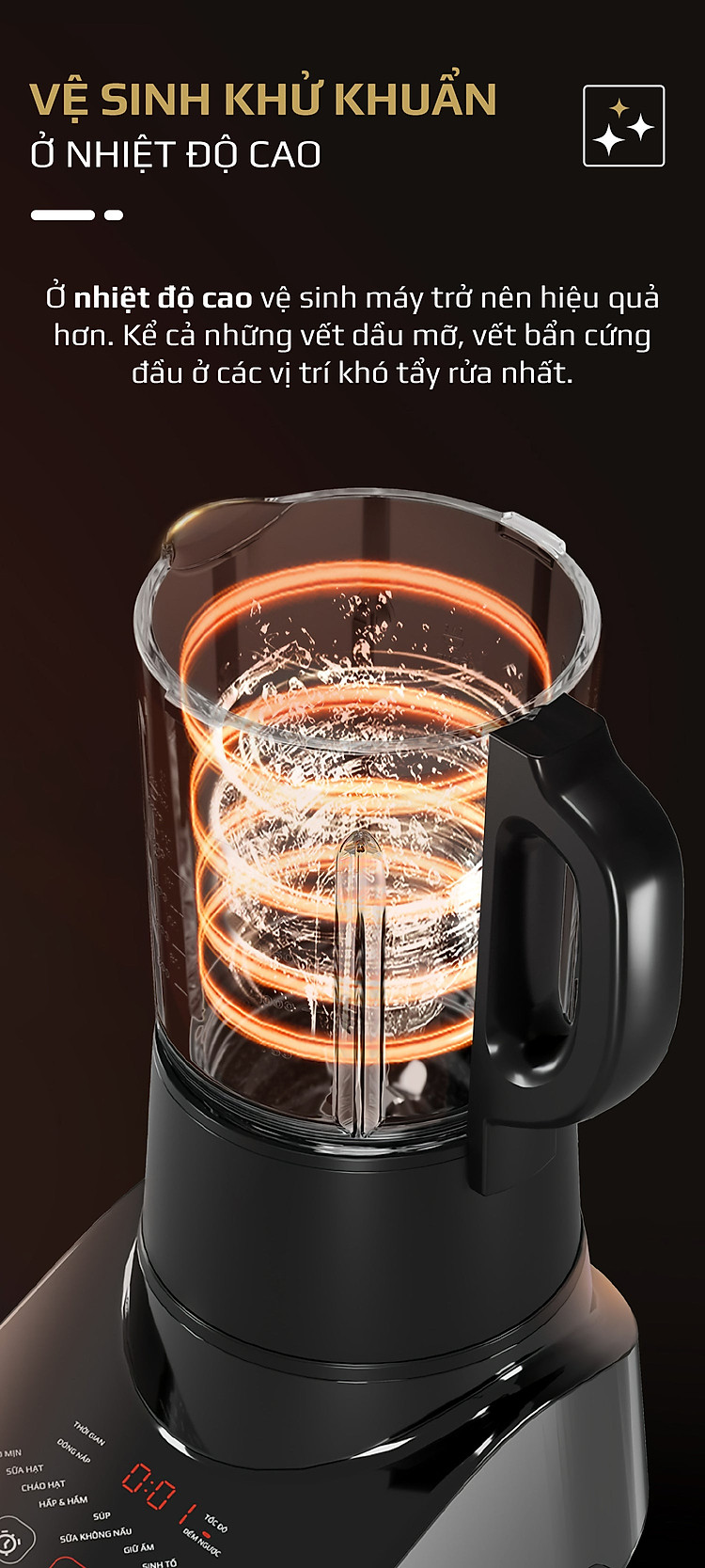 - Nấu nướng có thể không ngại nhưng việc lau dọn sau mỗi bữa ăn đúng là vấn đề khiến chị em rất đau đầu. Thấu hiểu điều đó, chiếc máy xay nấu đa năng thế hệ mới được tích hợp luôn tích năng vệ sinh khử khuẩn độc quyền ở nhiệt độ cao.