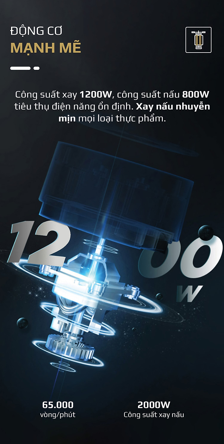 - Động cơ công suất lớn lên tới 2000W, tốc độ quay 65.000 vòng/phút thực sự là một khối động cơ rất mạnh cho một chiếc máy xay nấu. Dù động cơ công suất lớn nhưng do được trang bị hệ thống khe tản nhiệt lớn dưới đáy máy và mặt sau máy khiến máy hoạt động bền bỉ mà không bị nóng.