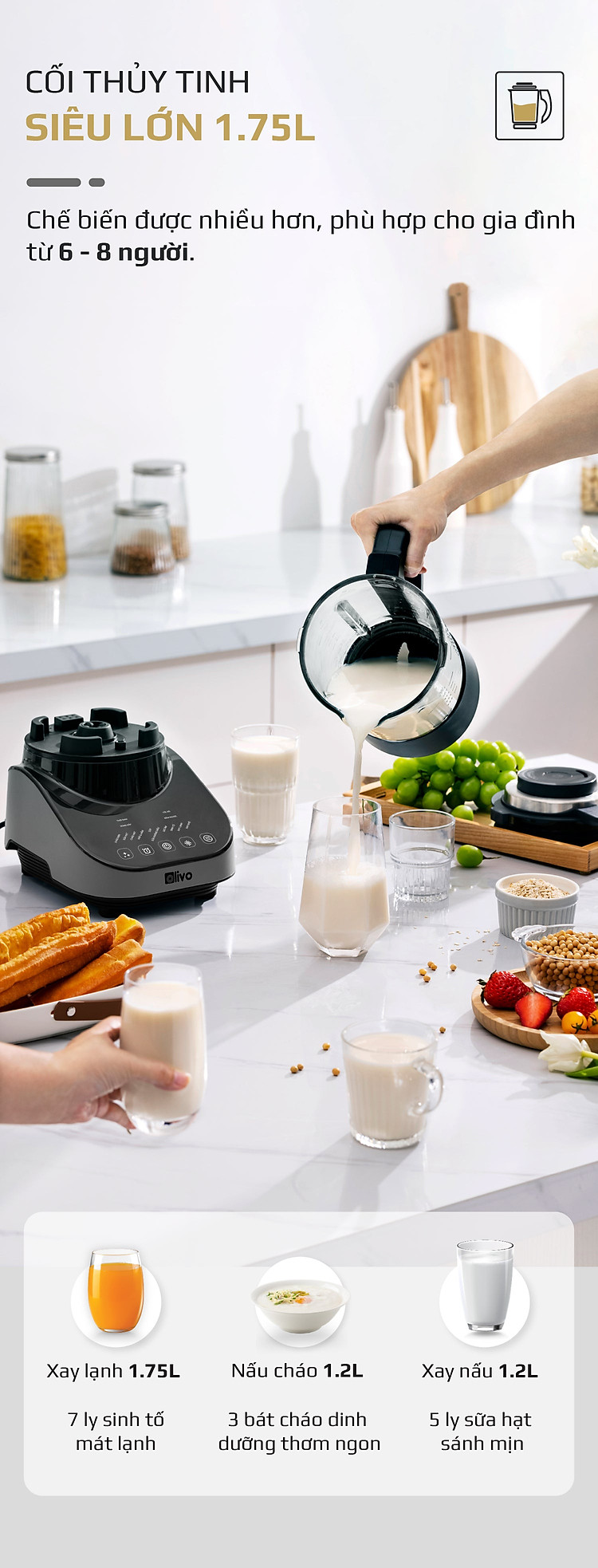 - Dung tích cối xay nấu lớn 1.75L có thể chế biến được nhiều hơn phù hợp cho gia đình từ 6 - 8 người. Chất liệu cối bằng thủy tinh borosilicate 5 lớp chịu lực, chịu nhiệt đến 300 độ C. Cối bằng thủy tinh nên bạn có thể dễ dàng quan sát quá trình nấu.