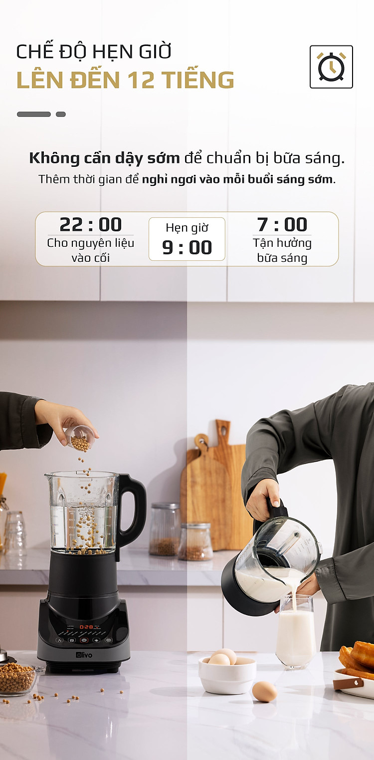 - Tạm biệt việc phải cố gắng dậy sớm vào buổi sáng để chuẩn bị bữa sáng. Với OLIVO CB20 bạn có thể chuẩn bị nguyên liệu từ tối hôm trước và bỏ vào máy sau đó chọn chức năng và bấm hẹn giờ 10 hoặc 12 tiếng tùy theo thời gian bạn mong muốn có bữa sáng vào ngày hôm sau.