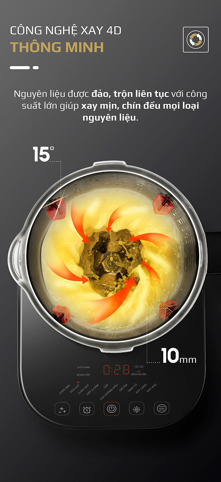 - Hiểu một cách đơn giản công nghệ xay 4D sẽ làm dòng nguyên liệu được đảo, trộn liên tục với công suất cực kỳ lớn hỗ trợ xay mịn, chín đều hơn.