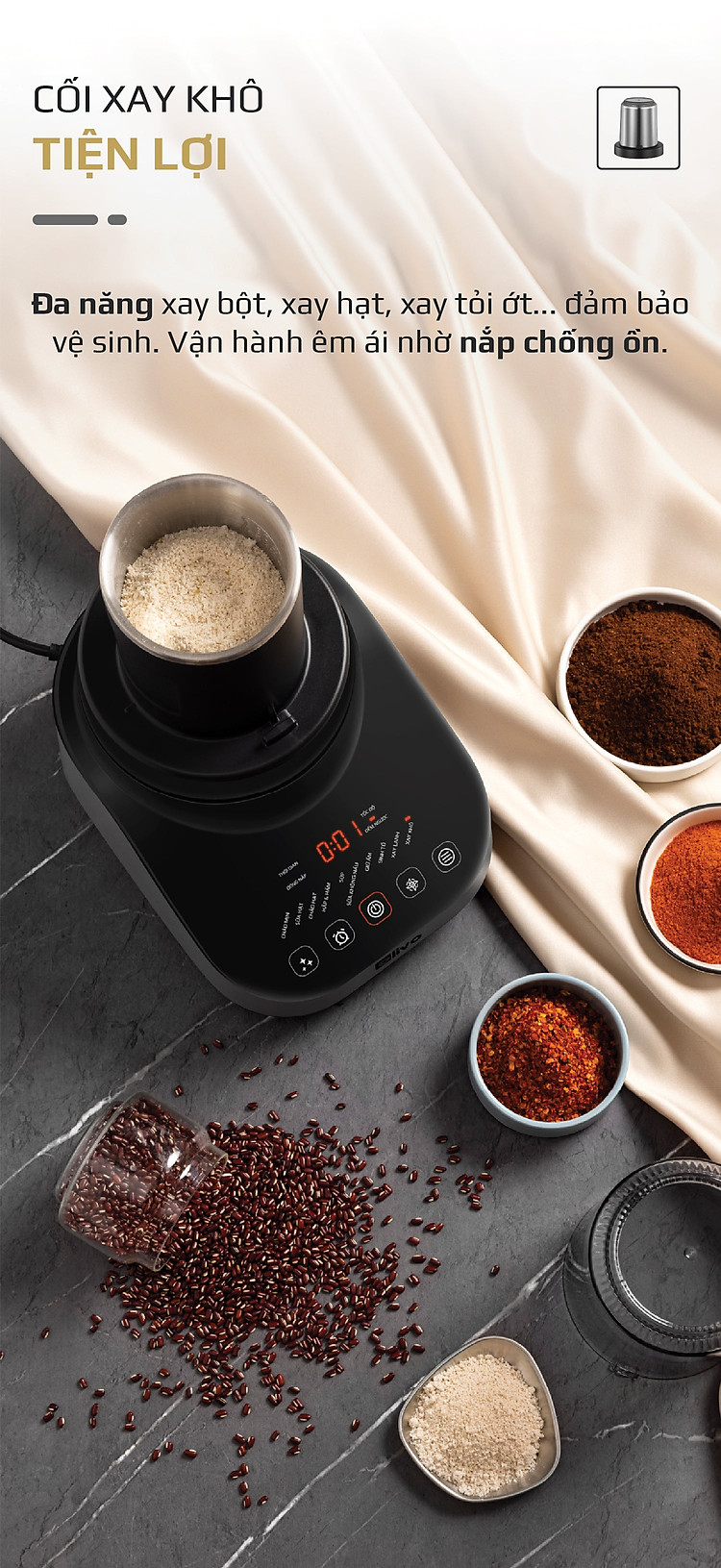 - Cối xay khô: sẽ chuyên dùng để xay những đồ khô như xay bột, xay hạt, xay tỏi ớt… vận hành êm ái nhờ nắp chống ồn.
