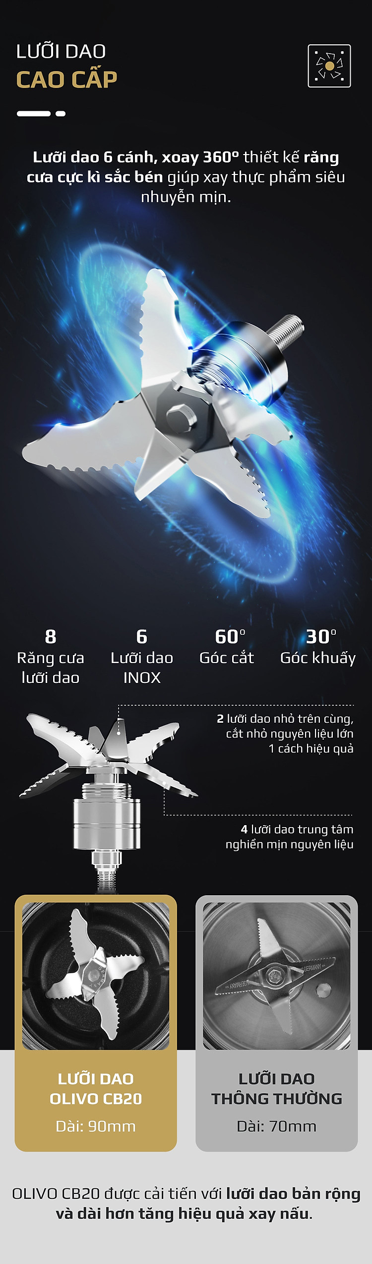 - Yếu tố quan trọng quyết định chiếc máy xay có xay nhuyễn mịn được hay không là phần lưỡi dao. OLIVO CB20 sở hữu lưỡi dao 6 cánh, xoay 360 độ linh hoạt. Lưỡi dao thiết kế răng cưa đồng thời được cải tiến lên bản rộng và dài hơn để có thể xử lý gọn mọi loại nguyên liệu.