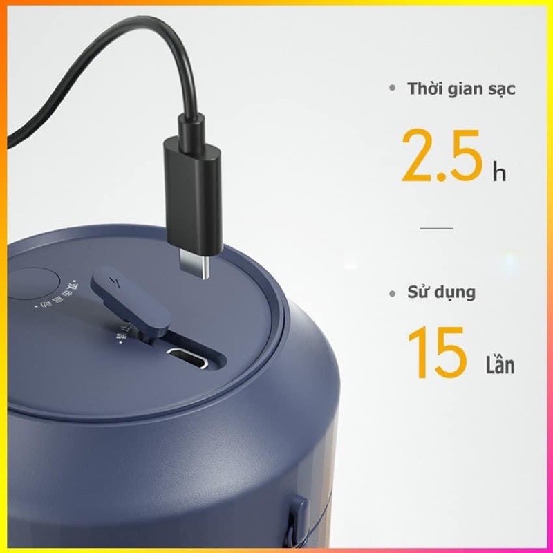 -Máy xay Sinh tố mini cầm tay tiện lợi hoạt động không cần cắm điện, pin sạc 3000 mAh 1 lần sạc sử dụng được 15 lần.