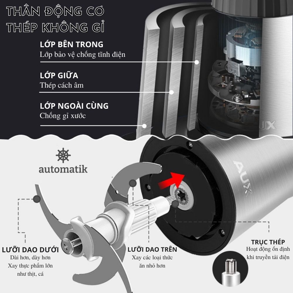 2 lưỡi dao kép: Lưỡi dưới dài hơn để xay thịt; lưỡi trên: xay các loại thức ăn nhỏ hơn