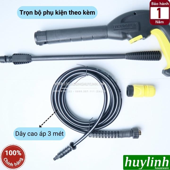 - Máy xịt rửa Karcher được tích hợp với 1 vòi phun thẳng KHÔNG tùy chỉnh áp lực. Áp lực tối đa lên đến 110 bar, kết nối dây áp lực dài 3 mét, giúp việc làm sạch, xịt rửa xe, vệ sinh rong rêu, vệ sinh nhà tắm, tường nhà trở nên đơn giản và nhanh gọn.