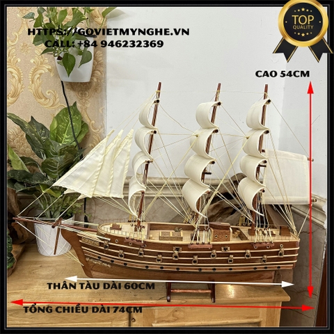 + 01 [Dài 74cm] Mô hình thuyền gỗ thuyền trang trí thuyền chiến cổ Napoleon - Thân tàu 60cm - Buồm màu Trắng- Gỗ Tràm.