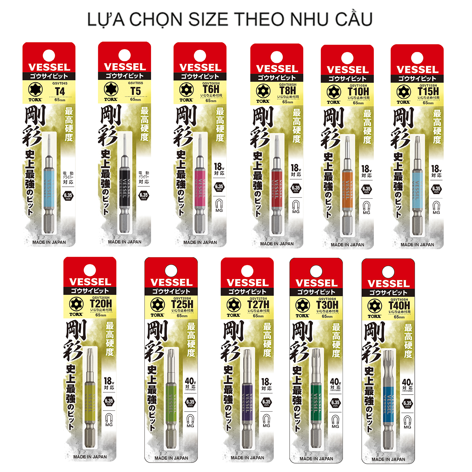 - Sản phẩm có nhiều màu khác nhau cho mỗi kích thước để dễ dàng phân biệt các loại mũi vặn vít.