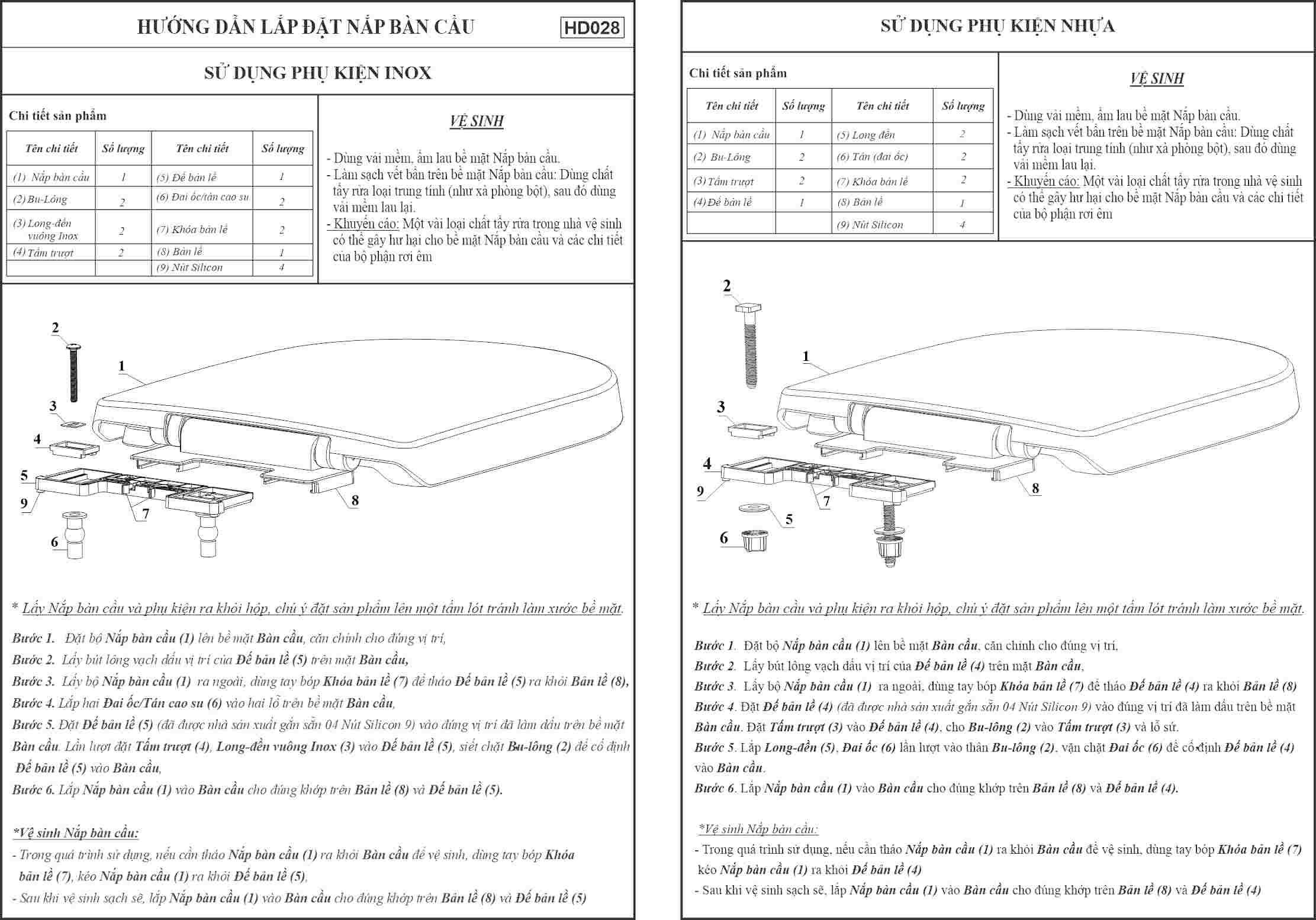 Hướng dẫn sử dụngLưu ý khi vệ sinh nắp bồn cầu:Lau chùi định kỳ sản phẩm bằng chất tẩy rửa trung tínhKhông sử dụng bàn chải sắt thép, chất tẩy rửa có tính axit mạnh, tính kiềm mạnh...lau chùi vì có thể gây hư hỏng bề mặt sản phẩmKhông đứng lên nắp bồn cầu, có thể gây hư hạiKhông để cạnh nguồn nhiệt có thể gây biến dạng hoặc hư hỏng sản phẩmKhông để trực tiếp dưới ánh sáng mặt trời.