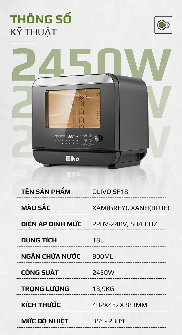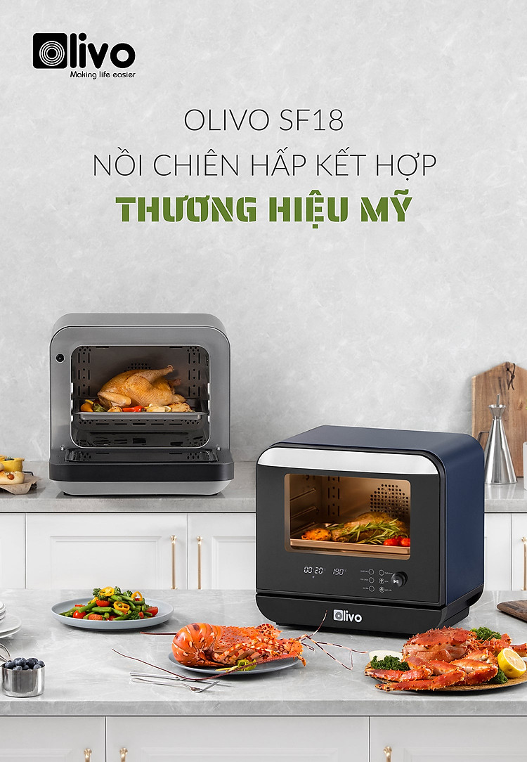 - OLIVO mang lại sự đột phá về công nghệ hết sức độc đáo khi kết hợp những tính năng như hấp, chiên, nướng, hầm chỉ trong một sản phẩm duy nhất là SF18.