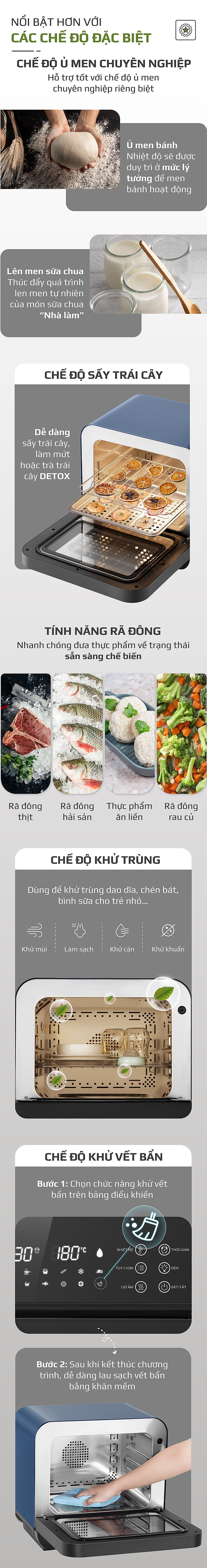 - Đây cũng là những tính năng được nhiều chị em nội trợ sử dụng giúp chế biến nhiều món phụ như làm bánh, làm sữa chua cho các bé trong nhà, và nhất là việc sấy trái cây làm trà Detox tác dụng lớn trong quá trình giảm cân cho chị em.