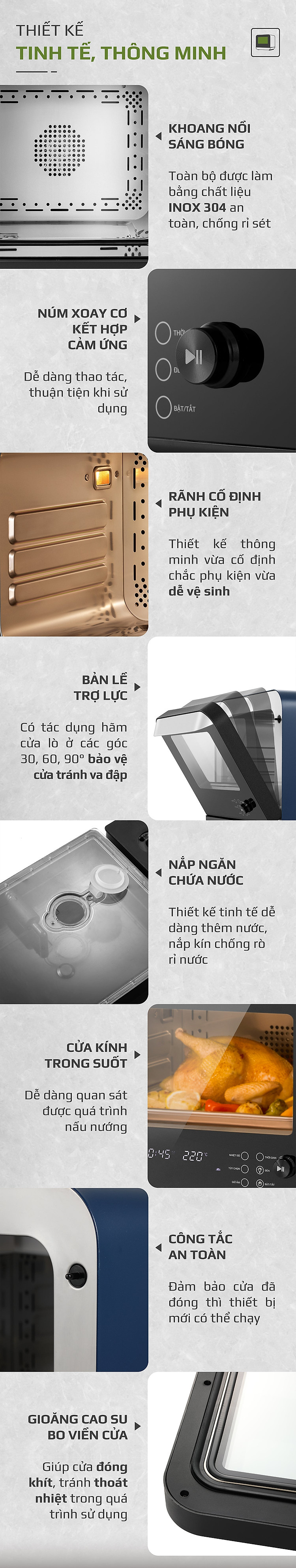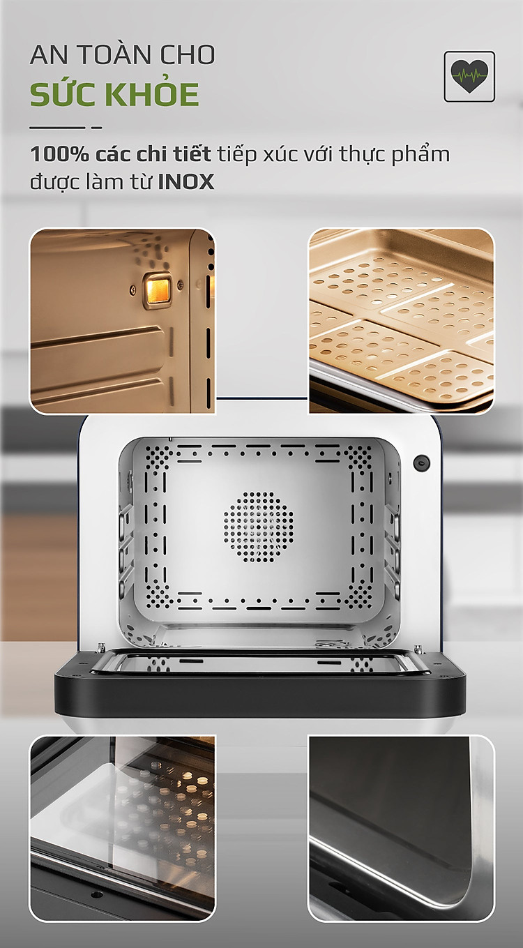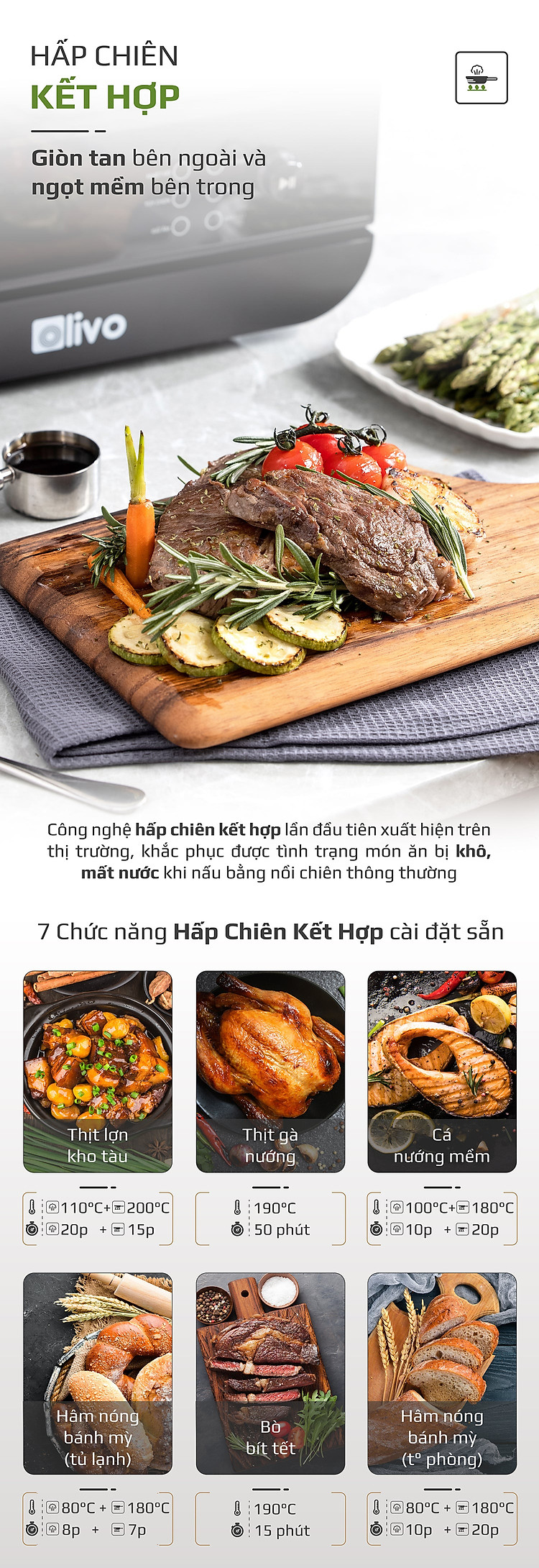 - Với công nghệ phun hơi nước siêu nhiệt giúp món ăn chín đều, giữ được độ mềm ẩm và vị ngọt tự nhiên của thực phẩm.