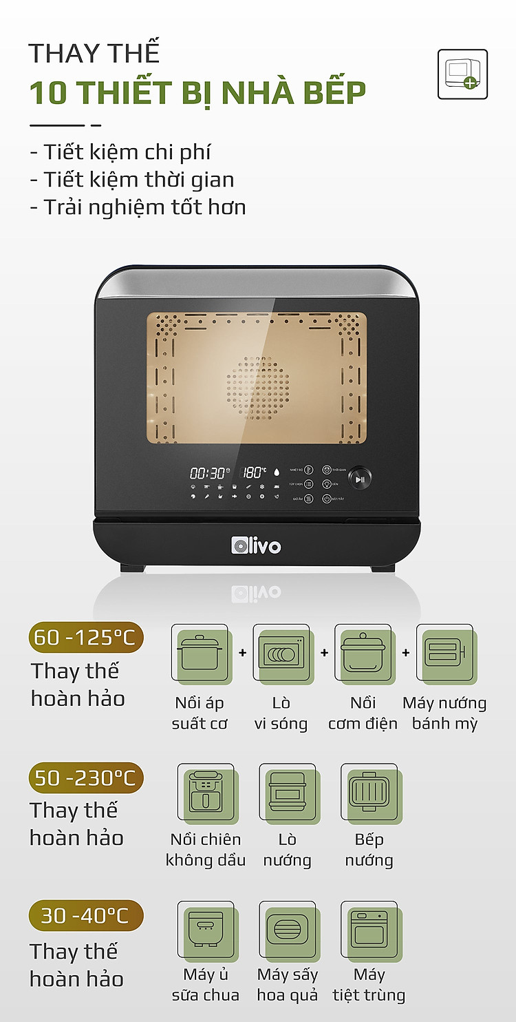 - Không còn phải lo lắng tốn kém chi phí và không gian để thiết bị chật hẹp của căn bếp nhà bạn khi OLIVO SF18 có thể sử dụng chức năng tương đương với 10 thiết bị nhà bếp khác nhau như : nồi chiên không dầu, nồi hấp, nồi áp suất, máy sấy hoa quả, máy ủ sữa chua, bếp nướng ….