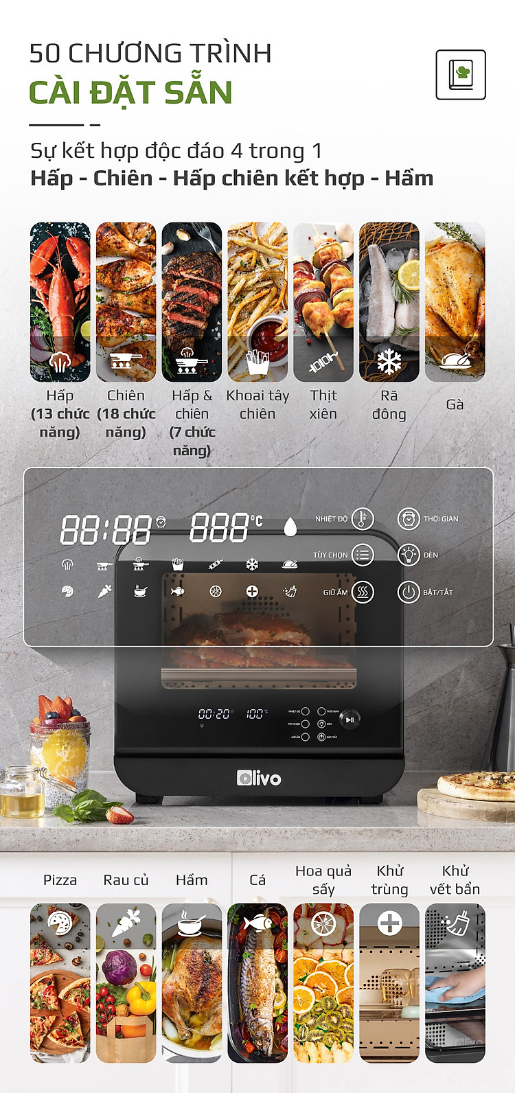 - Hiện nay duy nhất chỉ có trên OLIVO SF18 tính năng kết hợp Chiên hấp trong một chương trình nấu một trải nghiệm đỉnh cao mà quý khách hàng không thể có được khi sử dụng các sản phẩm khác trên thị trường.