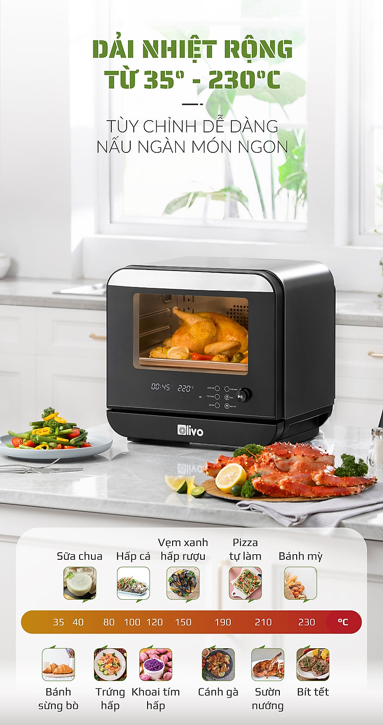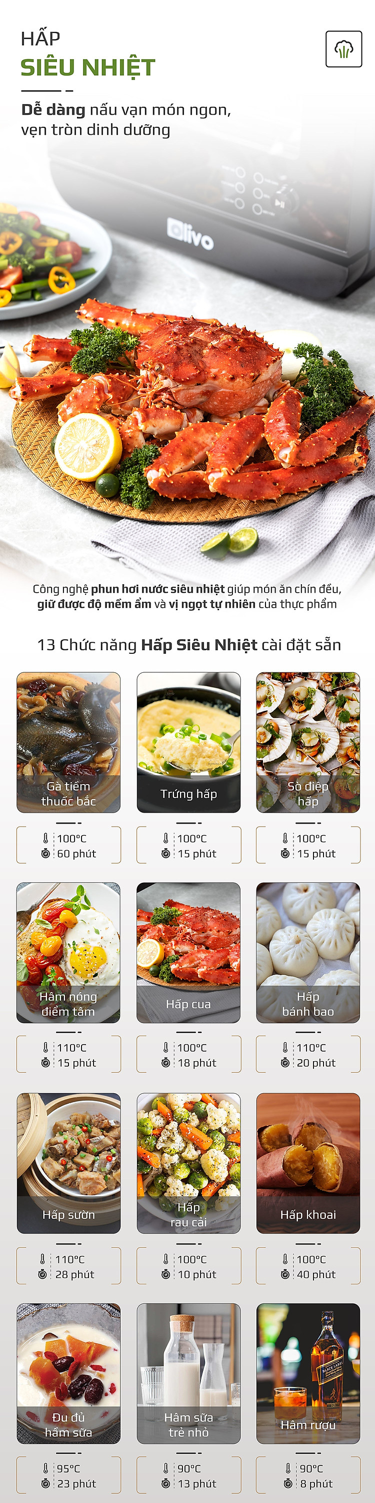 - Món hấp từ lâu được mệnh danh là món ăn tự nhiên, giữ trọn hương vị và bổ dưỡng nhất, thực phẩm không bị mất nhiều chất dinh dưỡng trong quá trình nấu. Chính vì vậy OLIVO SF18 được trang bị tính năng hấp siêu nhiệt có thể hấp chín tròn vị mọi thực phẩm.