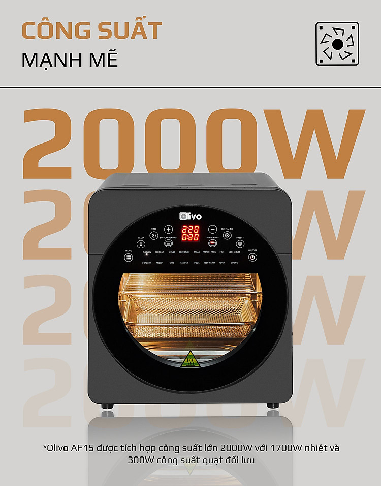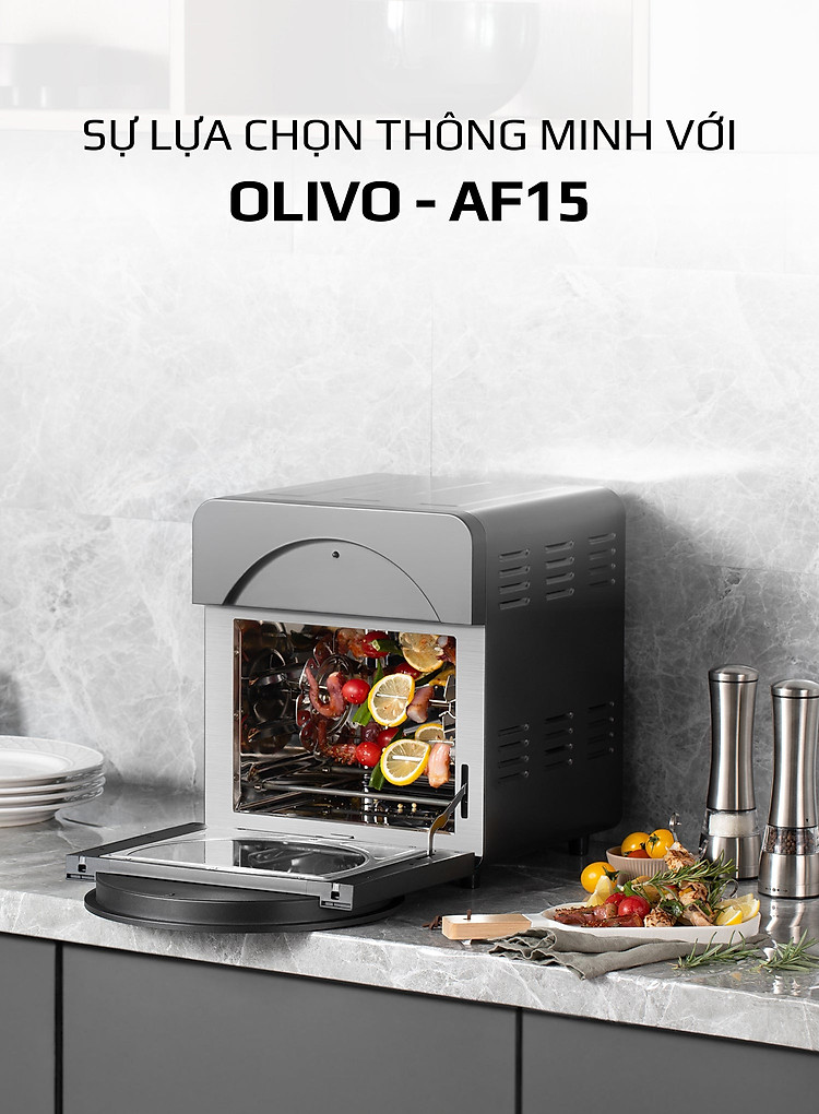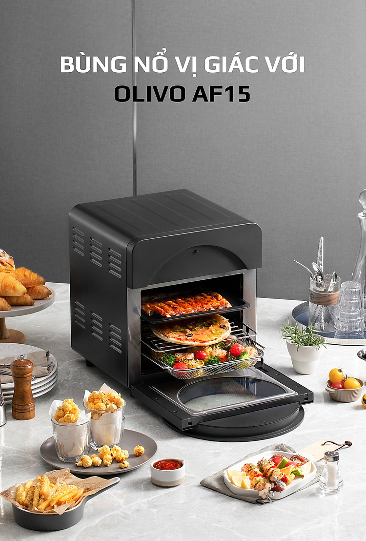 - OLIVO AF15 có thể được sử dụng thay thế các thiết bị nhà bếp khác như lò nướng, lò vi sóng, bếp nướng, máy sấy hoa quả, máy nướng bánh mì, máy làm bỏng ngô và máy làm sữa chua, nồi chiên sâu, máy làm bít tết.