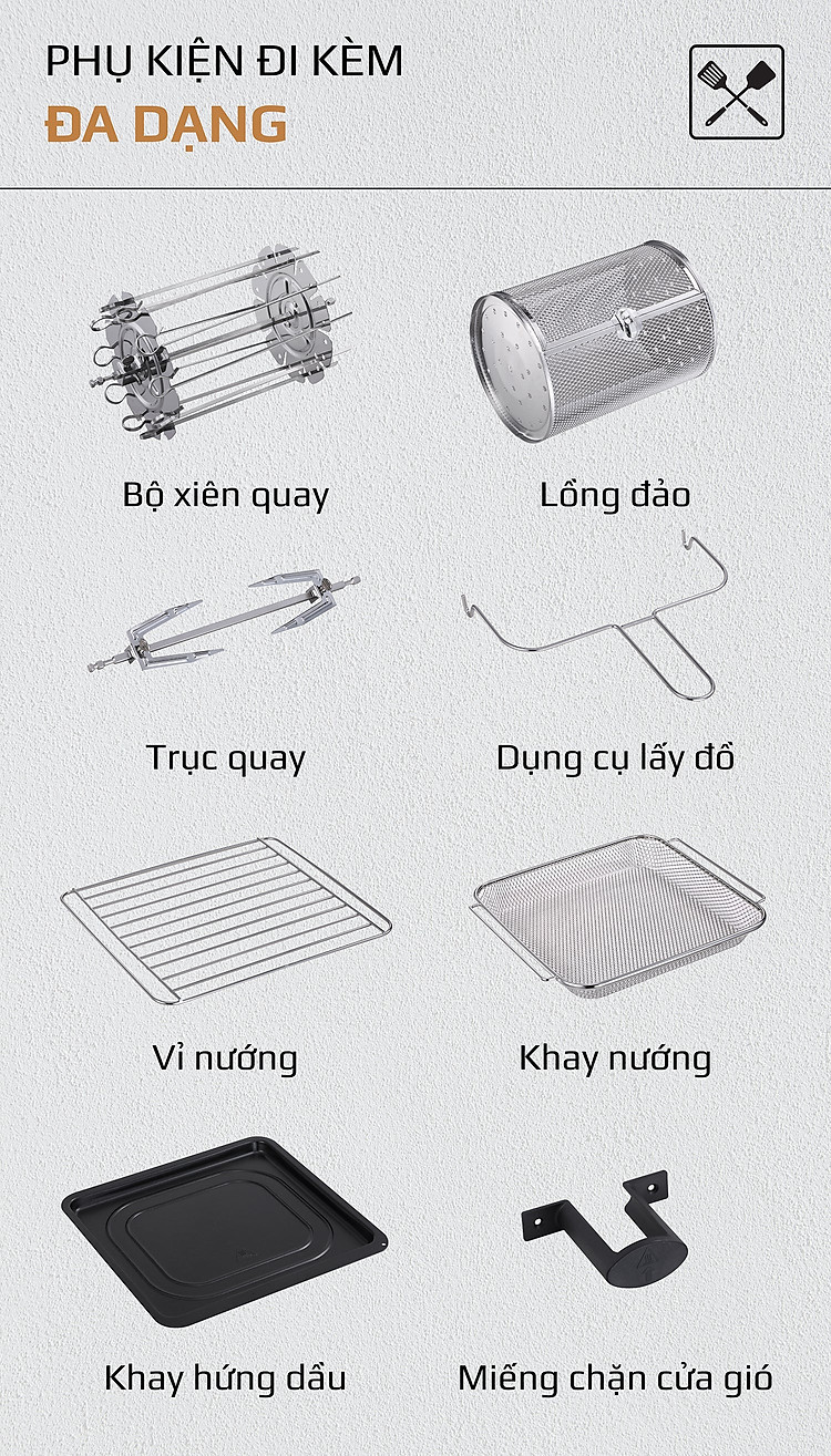 - Bộ phụ kiện này kết hợp với những tính năng và công nghệ tiên tiến ưu việt có trên OLIVO AF15 giúp bạn có thể làm vạn món ngon, đổi món liên tục mà không bị ngấy và nhàm chán.