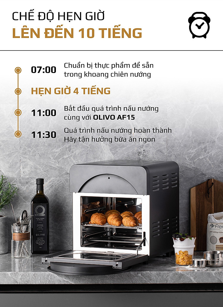 - Có trên OLIVO AF15 là một tính năng đặc biệt dành cho các bà nội trợ bận rộn và hiện đại. Nấu ăn mọi lúc, bất kì khi nào bạn cần với chức năng hẹn giờ độc đáo CHỈ CÓ trên OLIVO AF15.