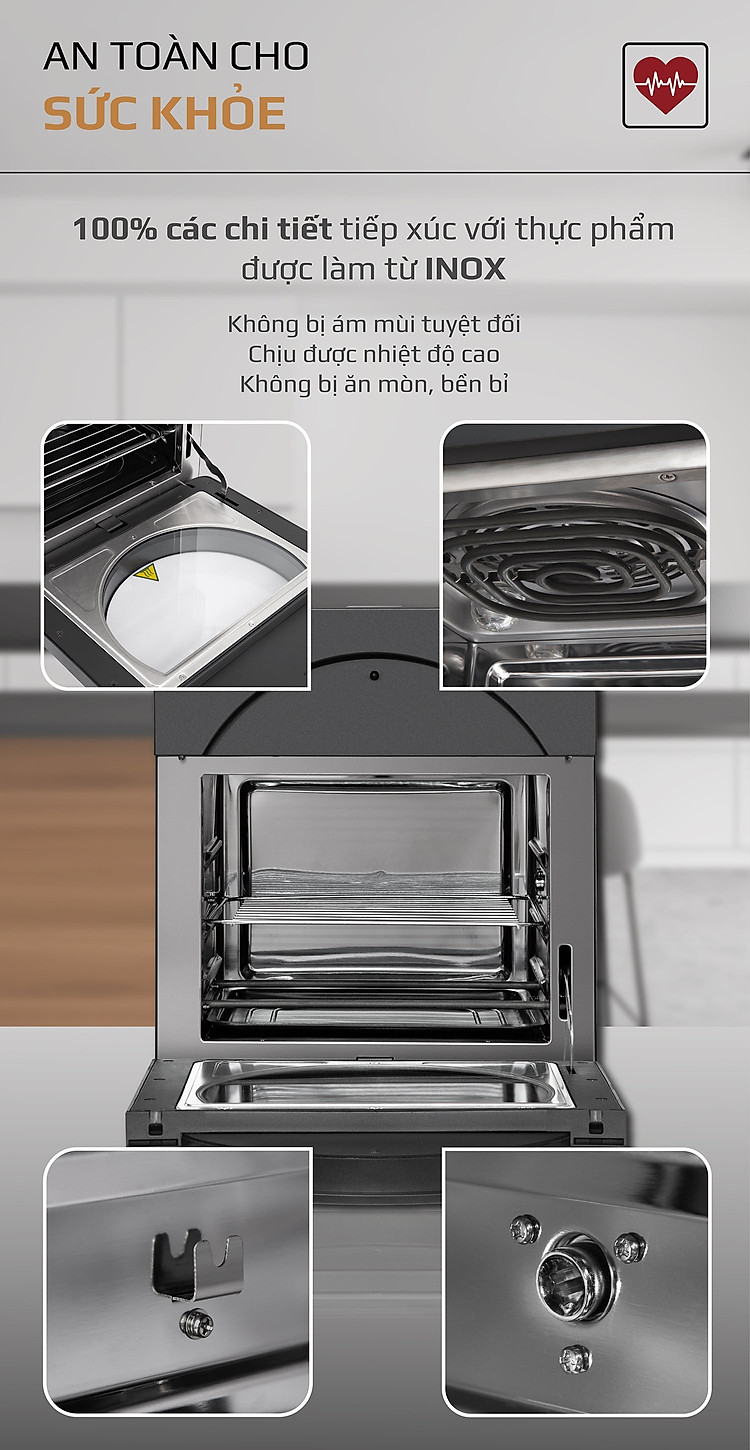 - Do sự kết hợp giữa động cơ công suất lớn cùng với quạt mô tơ cao cấp giúp cho quá trình làm chín thức ăn diễn ra êm ái, không gây tiếng ồn khó chịu, giúp cho khi chế biến món ăn yên tĩnh không ảnh hưởng đến các hoạt động xung quanh.