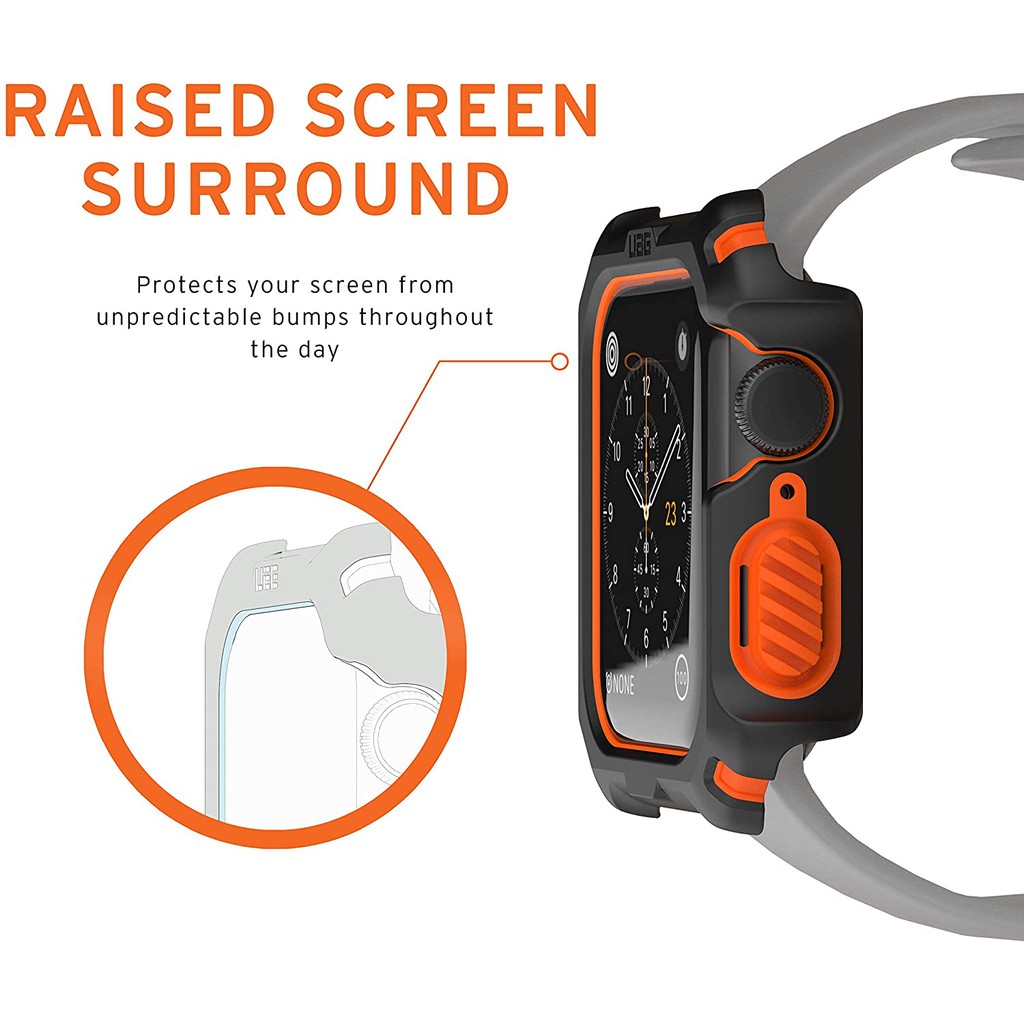 Bảo vệ Apple Watch của bạn khỏi các yếu tố gây trầy xướt. Ốp chống sốc UAG được thiết kế hầm hố với 2 lớp bảo vệ, dễ dàng sử dụng núm vặn và các cạnh được thiết kế dâng cao lên để bảo vệ mặt đồng hồ tránh các vết nứt và trầy xước.