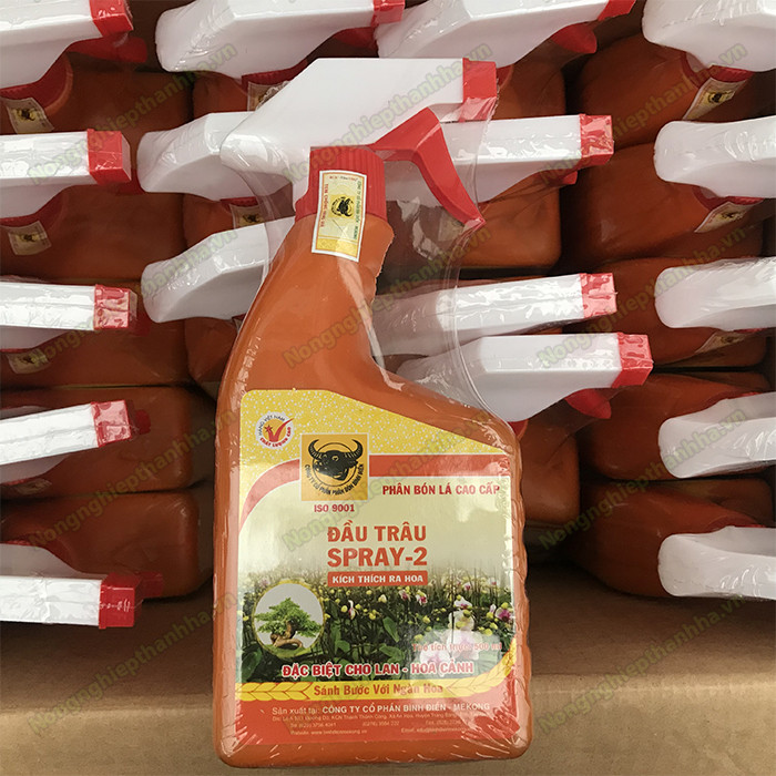 Phân bón lá đầu trâu kích ra hoa SPRAY 2 - 500ml Mô tả: Sản phẩm phân bón lá dạng xịt đầu trâu SPRAY 2 được dùng chuyên cho rau màu và cây kiểng. Sản phẩm chứa các nguồn dinh dưỡng kích thích cây ra hoa tập trung và đều hơn. Với thiết kế dạng xịt phun sương rất tiện lợi và dễ dàng sử dụng đồng thời tăng thêm mức độ hiệu quả khi sử dụng phân bón cho cây trồng.