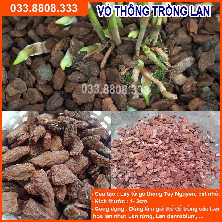 + Làm giá thể trồng lan: Vỏ cây thông là chất trồng hoặc làm giá thể cho cây lan bám rể rất tốt. Do vỏ thông giữ ẩm cao lâu mục, thì cây lan ta trồng sẽ phát triển nhanh và không phải thay giá thể nhiều lần. Vỏ thông có nhiều miếng to, nhỏ, mỏng và dày. Rất dể chọn cho phù hợp với cây lan. Rất phù hợp cho lan dòng hoàng thảo.Vỏ thông kết hợp trồng trong chậu giả gỗ thông thoáng rất thích hợp cho việc trồng lan.