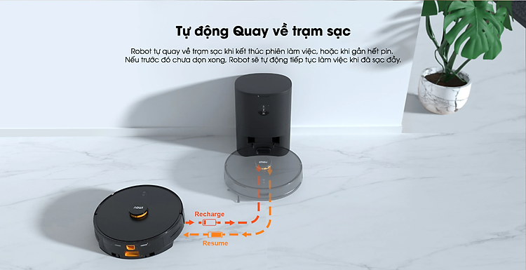 Robot tự quay về trạm sạc khi kết thúc phiên làm việc, hoặc khi gần hết pin. Nếu trước đó chưa dọn xong, Robot sẽ tự động tiếp tục làm việc khi đã sạc đầy.