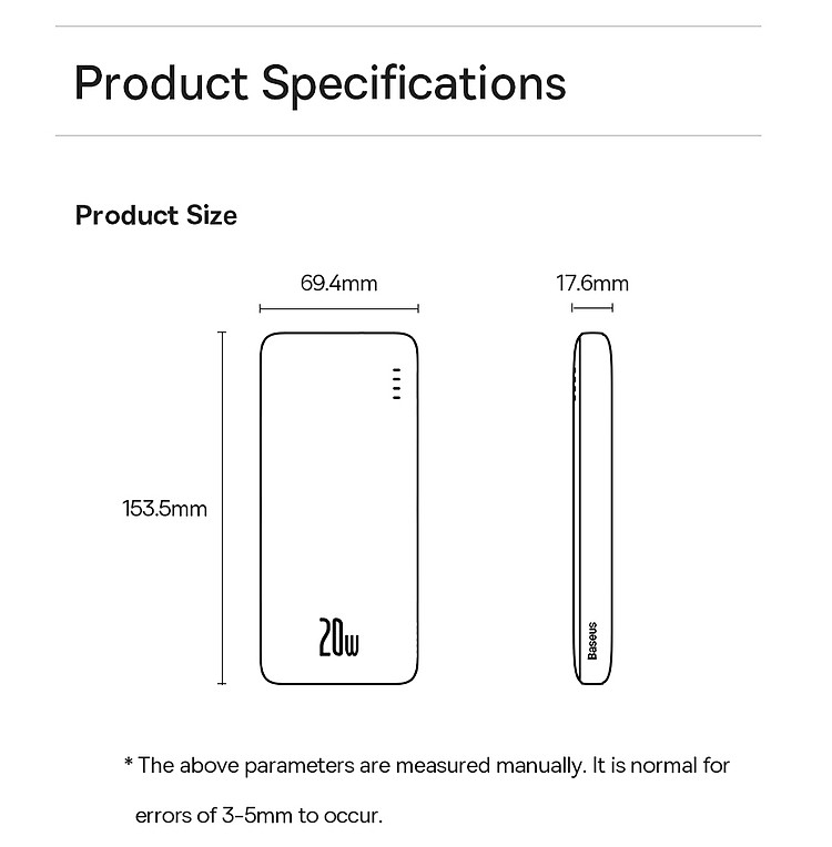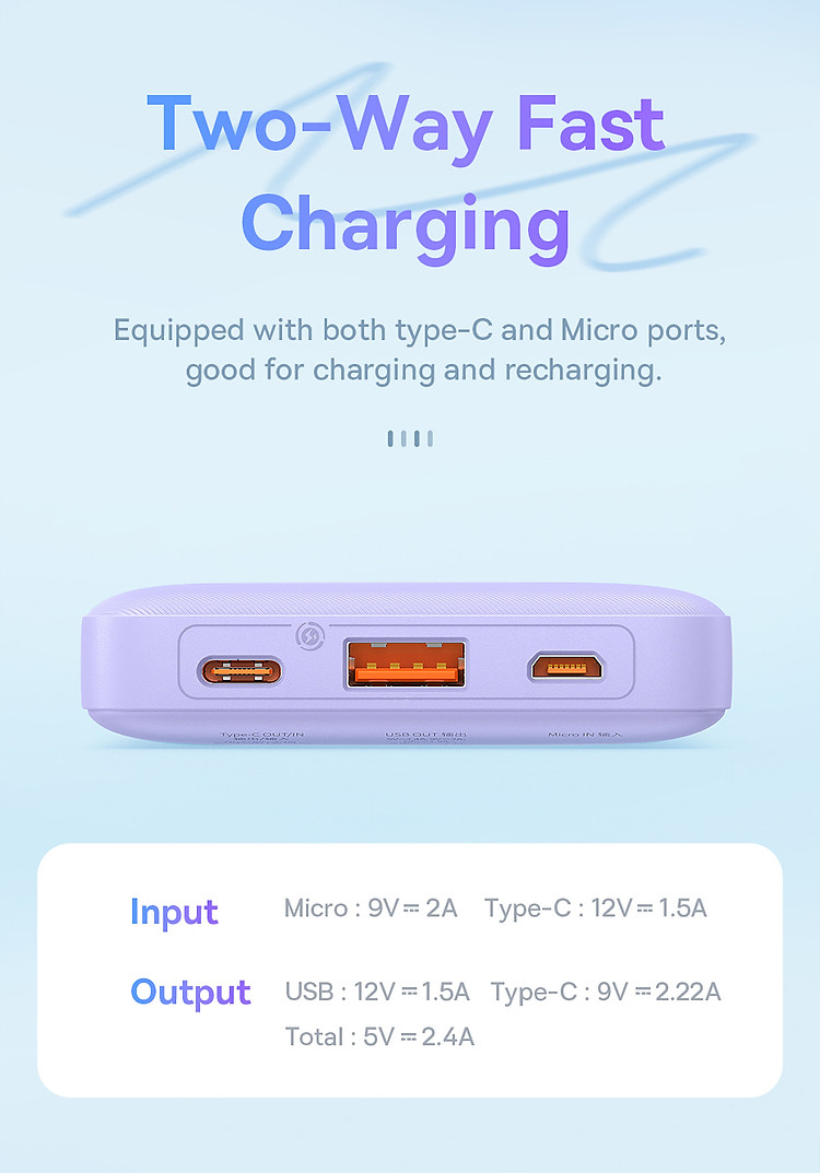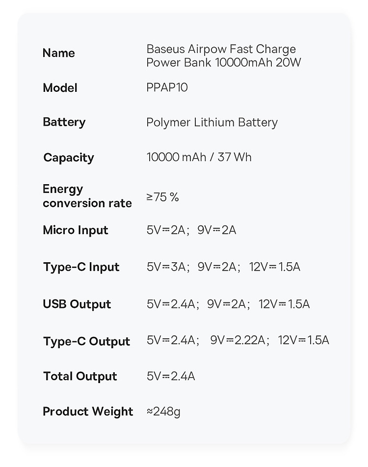 | Type-C Output | 5V-2.4A, 9V-2.22A, 12V-1.5A |