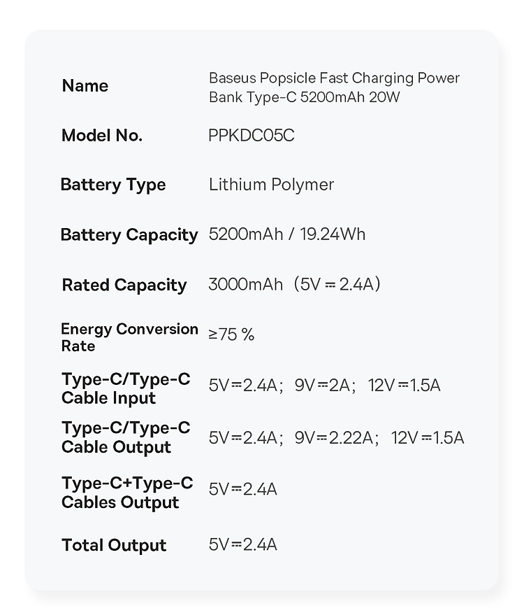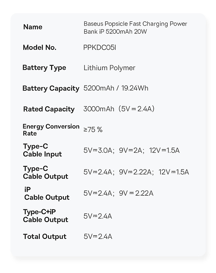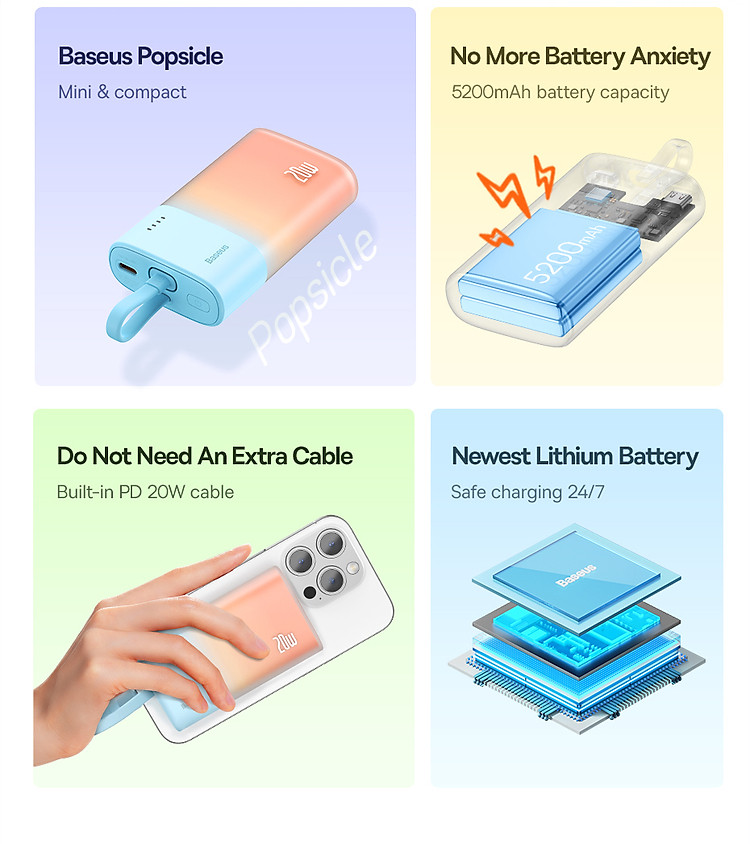 Sạc Dự Phòng OS-Baseus Popsicle Fast Charging Power Bank 5200mAh 20W là một giải pháp sạc di động đáng tin cậy, giúp bạn duy trì năng lượng cho các thiết bị của mình trong suốt ngày dài hoặc trong các chuyến đi.