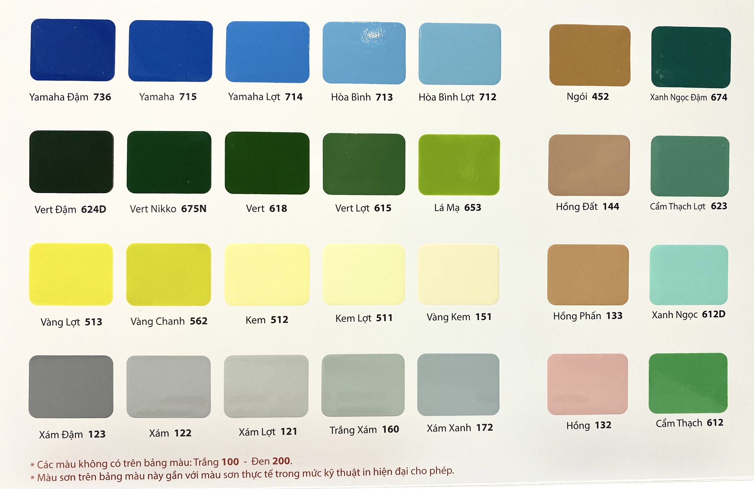 Mã màu Sơn Bạch Tuyết: màu Yamaha Đậm 736, màu Yamaha 715, màu Yamaha Lợt 714, Hoà Bình 713, Hoà Bình Lợt 712, Vert Đậm 624D, Vert Nikko 675N, Vert 618, Vert Lợt 615, Lá Mạ 653, Vàng Lợt 513, Vàng Chanh 562, Kem 512, Kem Lợt 511, Vàng Kem 151, Xám Đậm 123, Xám 122, Xám Lợt 121, Trắng Xám 160, Xám Xanh 172, Ngói 452, Hồng Đất 144, Hồng Phấn 133, Hồng 132, Xanh Ngọc Đậm 674, Cẩm Thạch Lợt 623, Xanh Ngọc 612D, Cẩm Thạch 612, Nâu 836, Nâu Đỏ 835, Đỏ Nâu 376, Đỏ 344, Xanh Rêu 657, Vàng Đồng Đậm 538, Vàng Đồng 537, Xám Vàng 522, Rêu Lợt 625, Xanh Lơ 711, Trắng Xanh 170, Cam 404, Vàng Cam 544, Vàng 542, Dương 705, Tím Môn 973, Nhũ Bạc 120A, Gạch 454, Cà Phê Sữa 536, Kem Đậm 152, Sơn Chống Rỉ Bóng – Mờ - Xám.