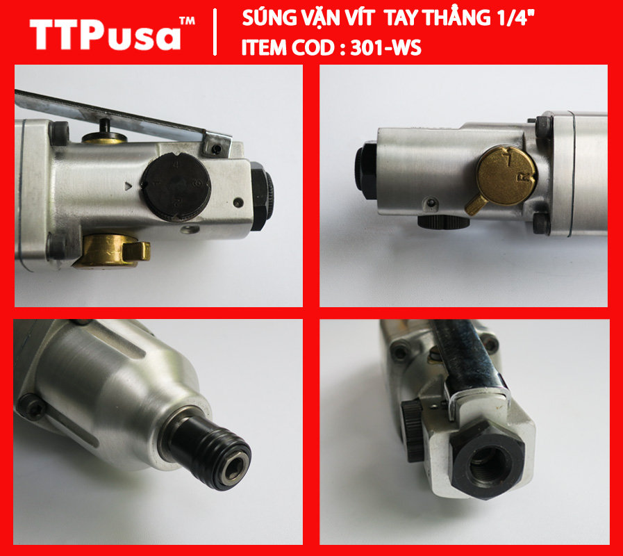 - Súng vặn vít thẳng 1/4" TTPusa 301-WS chuyên dùng để vặn ốc vít để lắp ráp hay để khoan. Súng vặn vít TTPusa không dùng điện mà dùng khí nén tạo ra từ máy nén khí. Rất thích hợp các tiệm sửa chữa, bảo trì và nhà máy xí nghiệp.