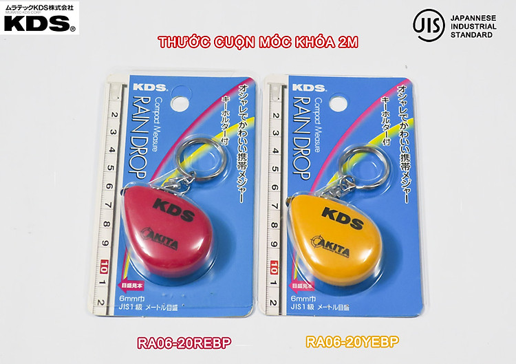 - Thước cuộn móc khóa 2m KDS có 2 màu vàng và đỏ cho bạn lựa chọn, tương ứng với 2 mã hàng là RA06-20YEBP và RA06-20REBP. Thước có móc khóa bạn có thể treo ở chìa khóa hay túi quần, rất dễ dàng mang theo khi thước nhỏ gọn.
