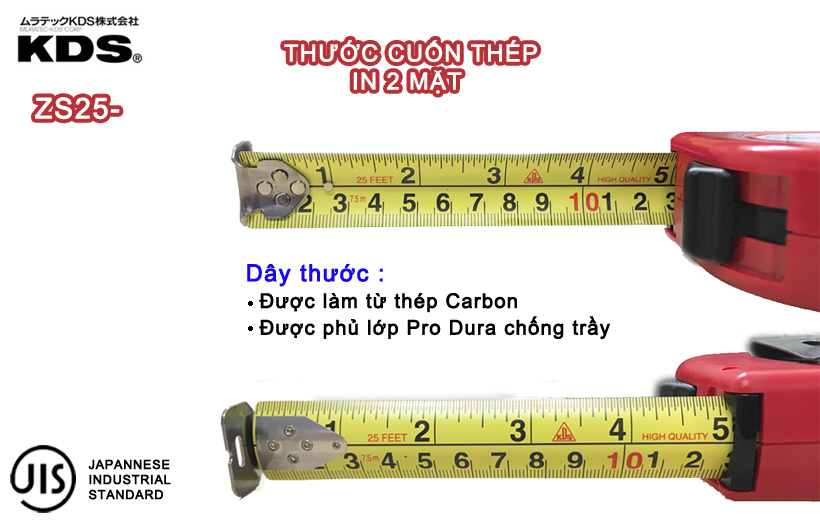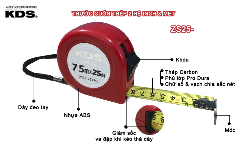 - Dây thước cuộn thép hệ Inch và Met KDS ZS kéo dài ra xa gấp đôi giúp bạn làm việc những nơi không kéo dây tới. Ngoài ra, dây thước cuộn thép KDS còn rất dẻo và đàn hồi bạn có thể cuốn như lò xo nhưng dây thước vẫn quay về thẳng hàng như cũ.