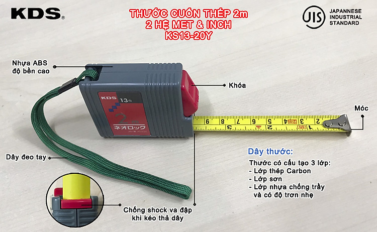 - Thước cuộn thép 2m KDS KS-1320Y đạt điểm 10 cho chất lượng và tuổi thọ của dây. Độ sai số của thước rất nhỏ đạt tiêu chuẩn đo lường của Nhật (JIS).