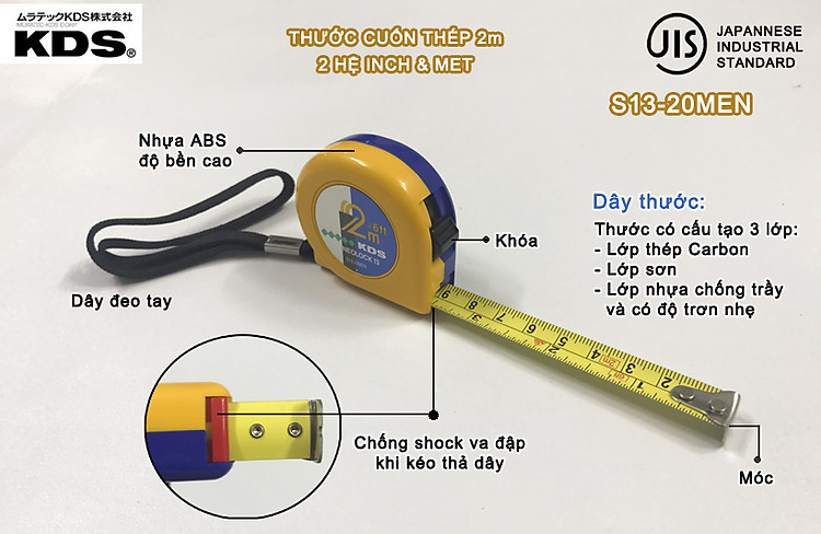 - Thước cuốn thép 2m KDS S13-20MEN được thiết kế chống va đập giữa vỏ thước và dây thước. Không những thế dây thước không có sắc bén ở 2 cạnh giúp bảo vệ người sử dụng không bị đứt tay.
