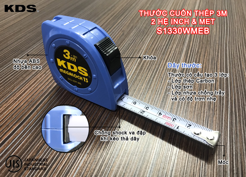 - Trong mọi gia đình và một số ngành nghề công nghiệp hiện đại, thước cuốn là trợ thủ đắc lực giúp phục vụ các nhu cầu công việc khác nhau của người dùng. Thước cuốn thép 3m KDS S1330W với tổng chiều dài là 3.0m được làm từ thép Carbon có độ bền cao, thước có thể kéo ra nhẹ và êm.