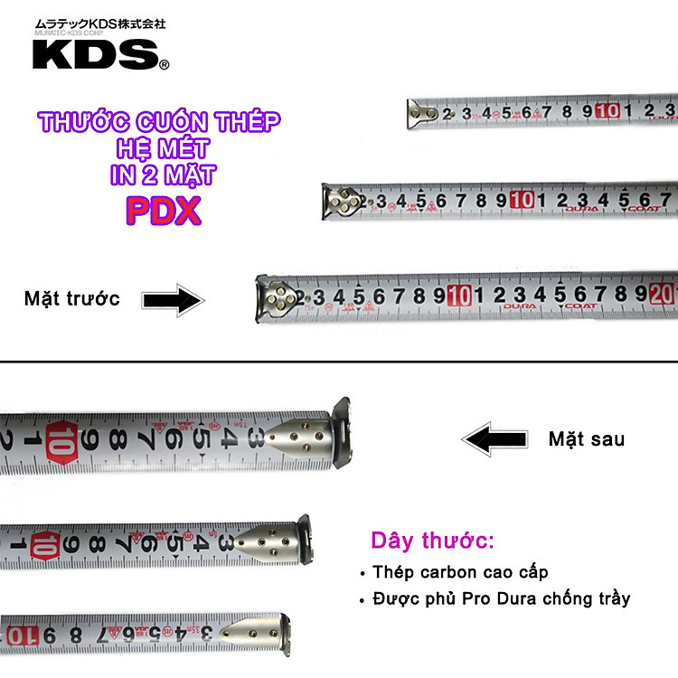 - Thước cuốn thép hệ mét KDS PDX được làm từ thép carbon có phủ Pro Dura chịu được sự mài mòn và cho độ bền cao với thời gian lâu dài. Có thể chịu trầy cho 10.000 lần kéo thả dây.Thước cuốn thép có lò xo mạnh mẽ giúp bạn làm việc lâu dài mà lò xo không hề giảm tuổi thọ.