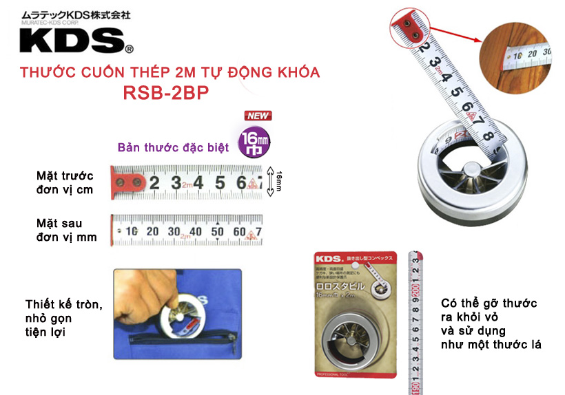 - Thước cuộn thép 2m tự động khóa KDS RSB-2BP rất phù hợp cho tất cả mọi người. Thiết kế tròn, nhỏ gọn đơn giản dễ cầm, bạn có thể cho vào túi áo và mang theo bên mình.